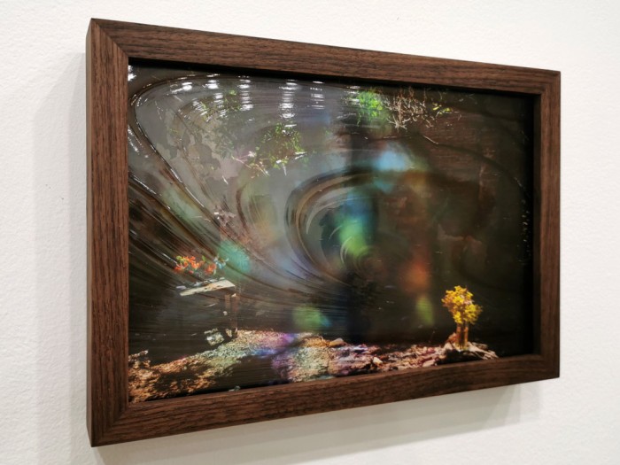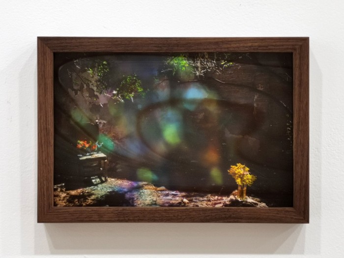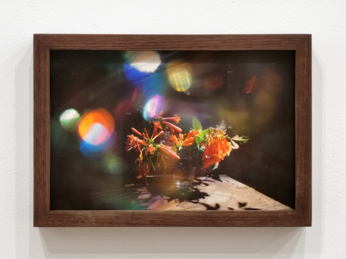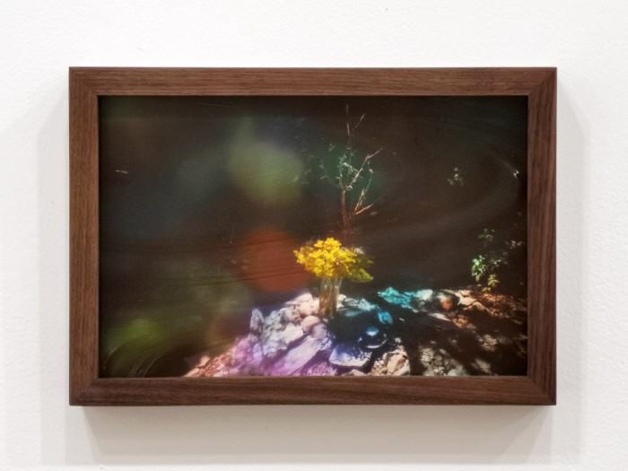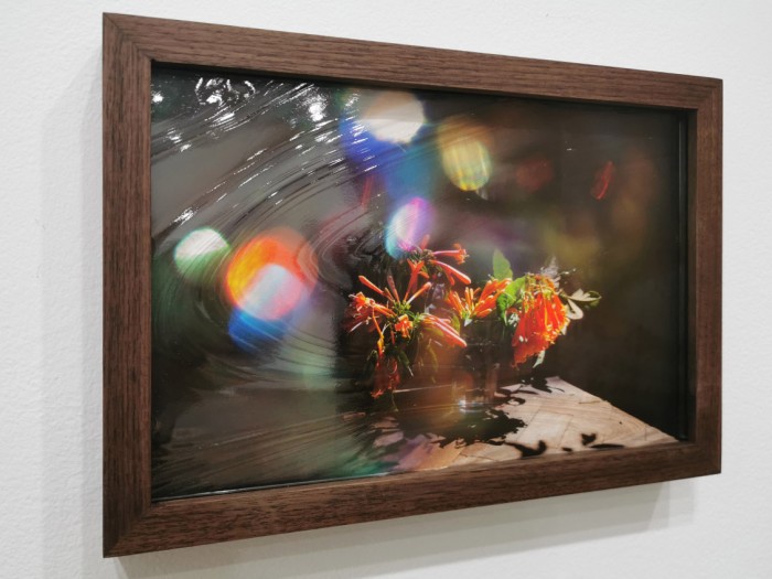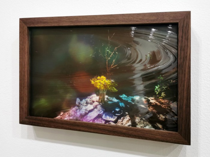 Three in a unique series of pre-production stills shot in preparation for the making of Hummingbird Guided Meditation (Gabriel’s garden). These prints are one-of-a-kind and framed under hand-crafted coloured and textured glass, which further distorts and obscures the image, allowing for a highly individuated and context-specific viewing experience.